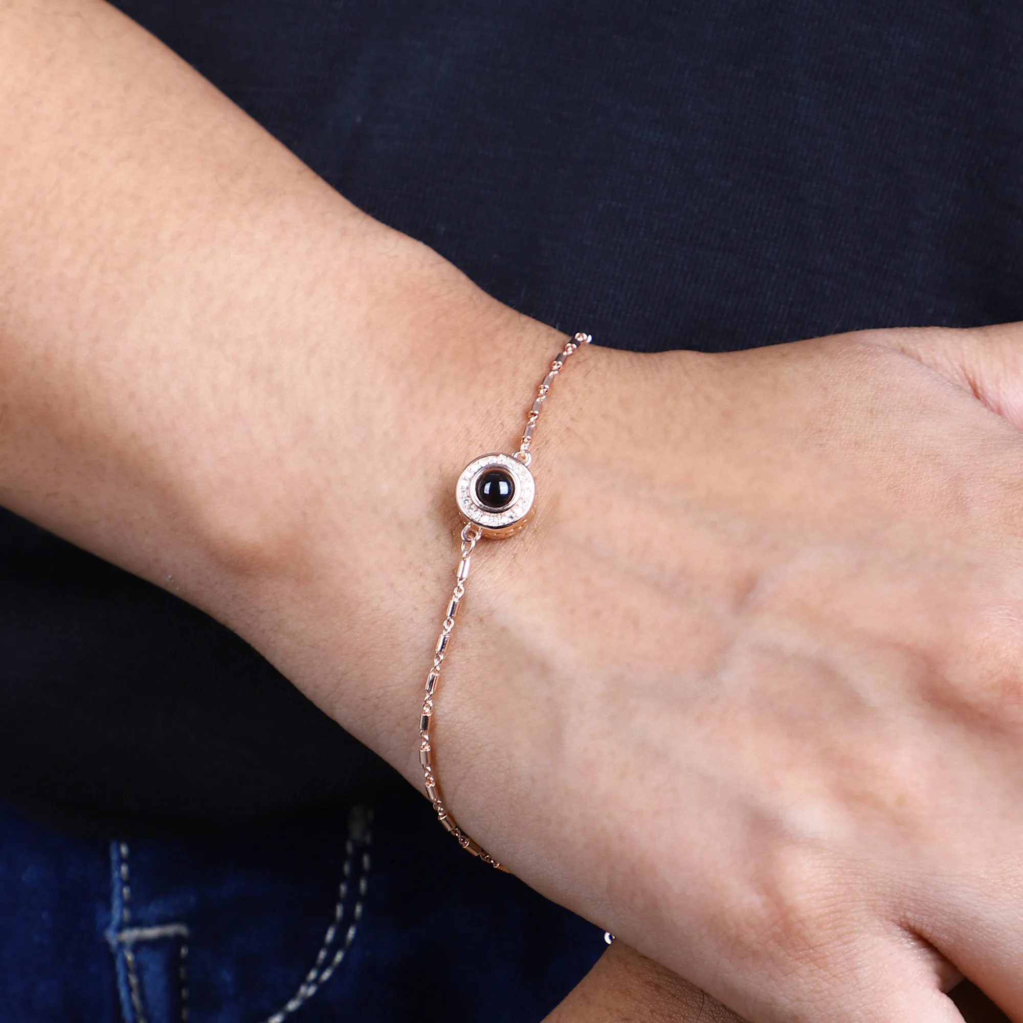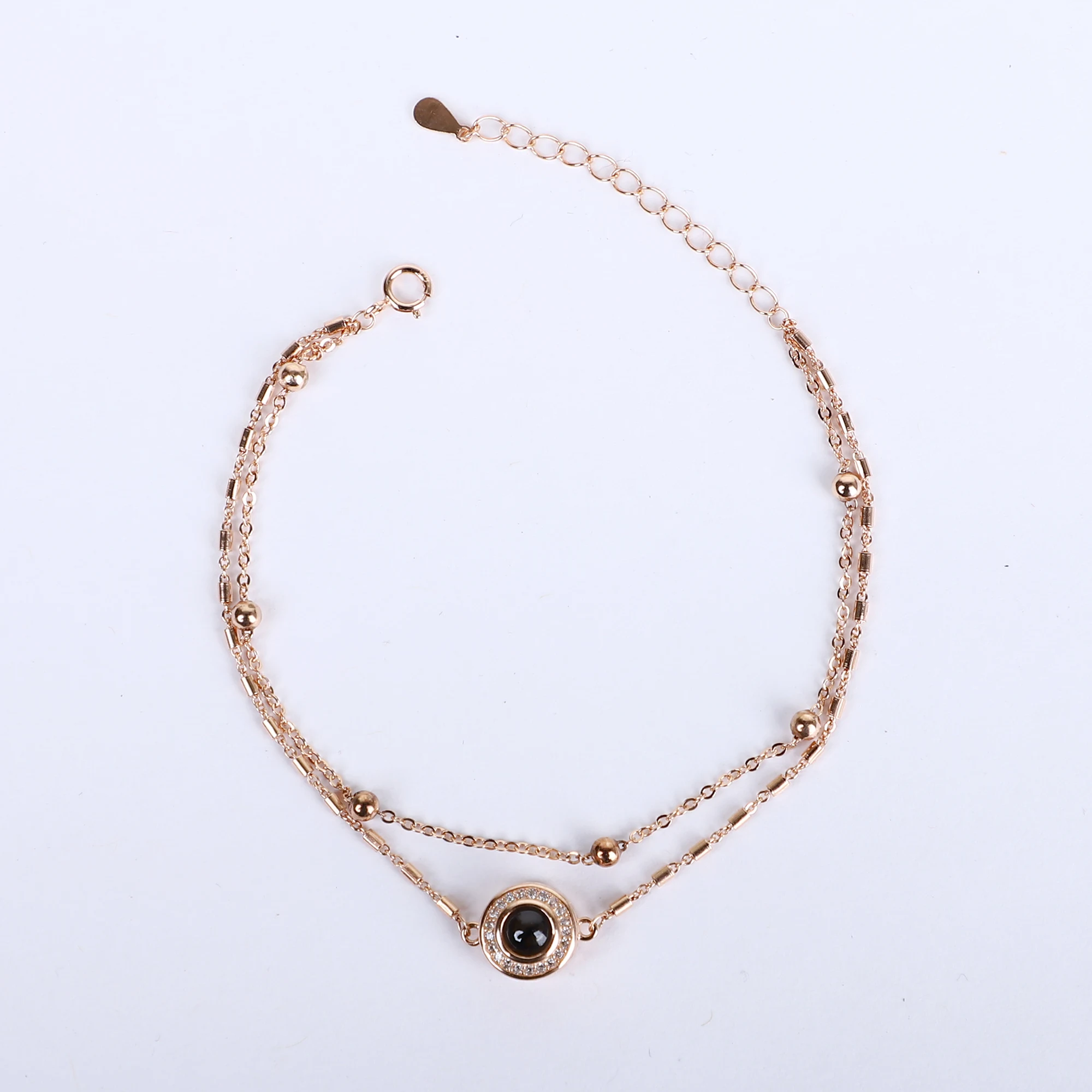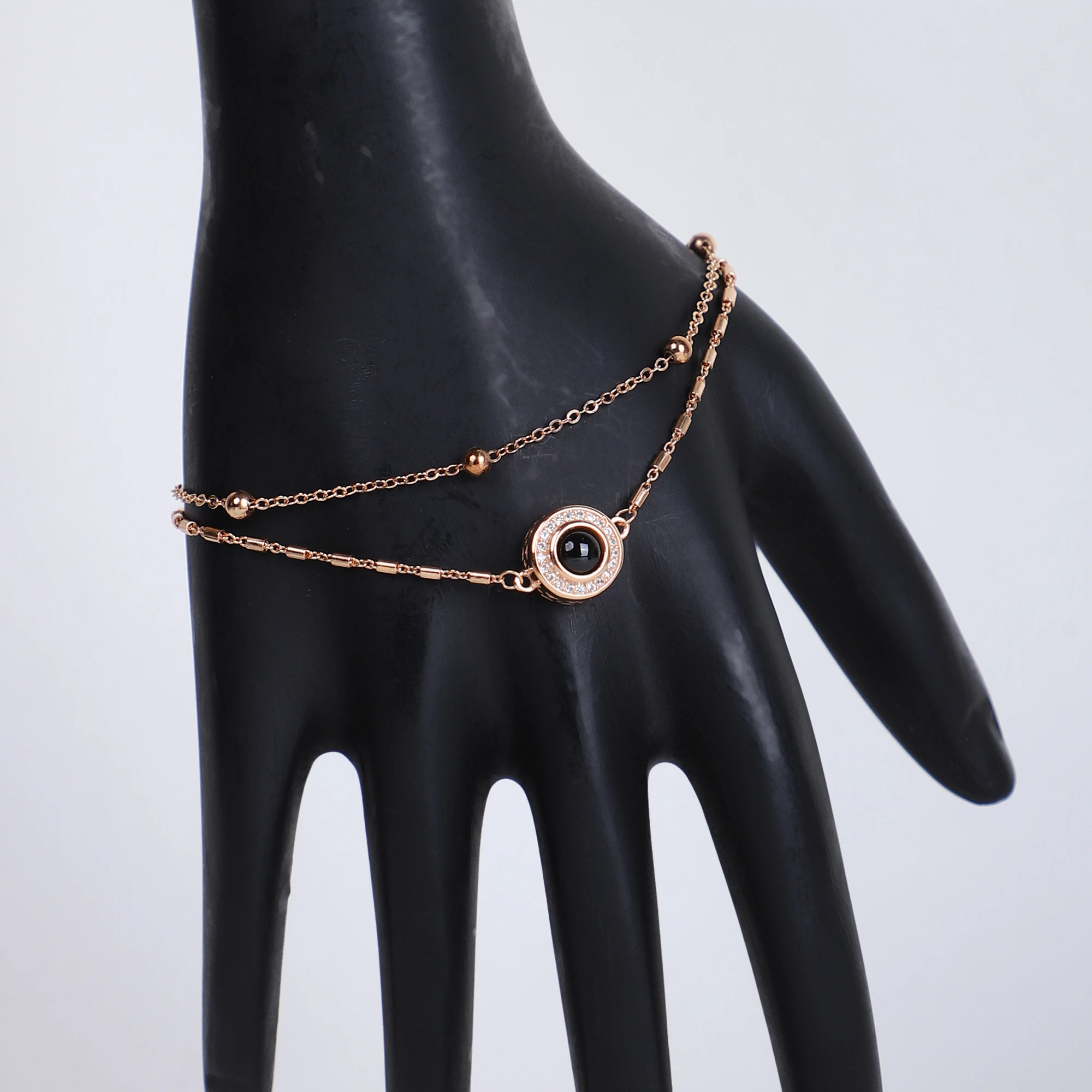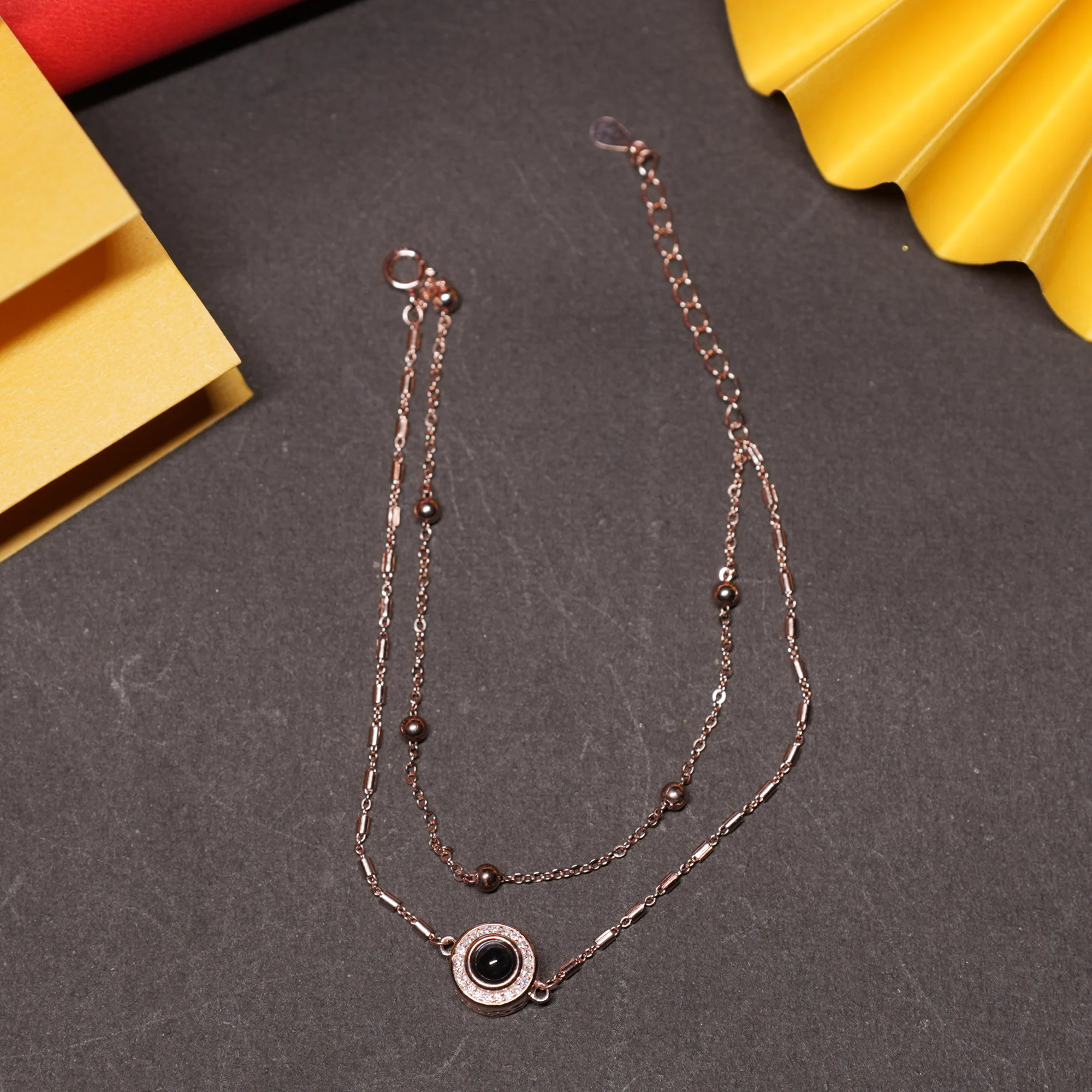 This elegant 925 silver chain, finished in rose gold, features a trendy double-layered design accented with polished beads and a central black evil eye charm. Symbolizing protection and style, it’s a modern accessory with a touch of meaningful tradition.