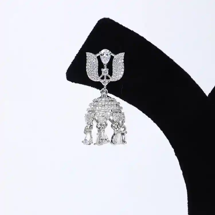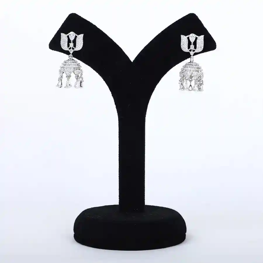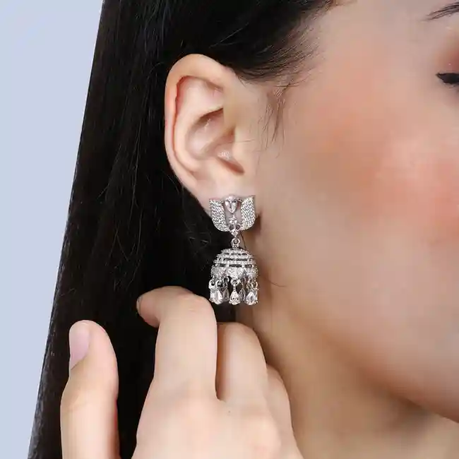 Exude timeless elegance with these 925 silver jhumka earrings, featuring a sparkling floral top and intricately designed dome with dangling zircon-studded drops. A dazzling blend of tradition and glamour, perfect for festive occasions and weddings.