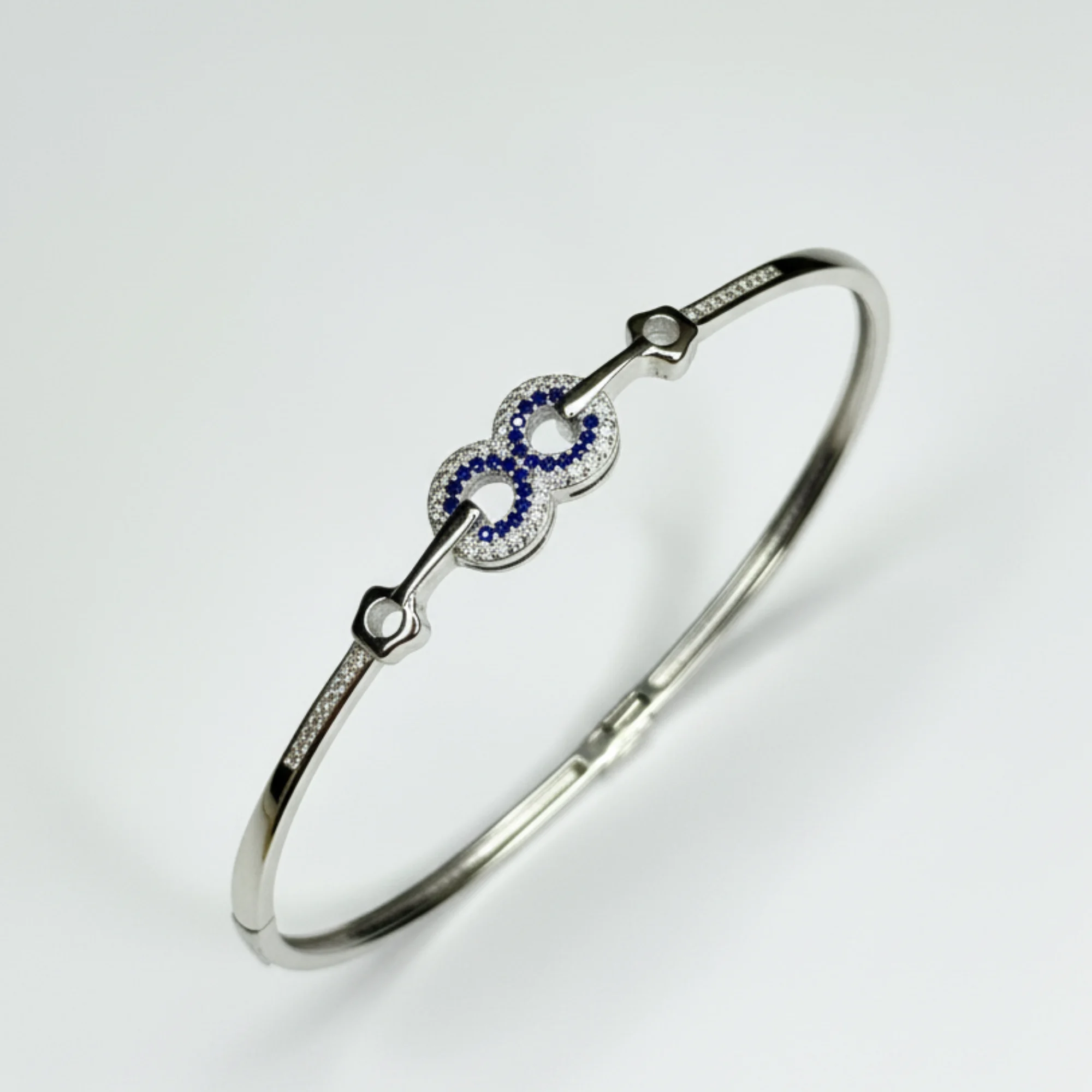 A sleek silver bracelet adorned with dazzling blue stones, radiating elegance and charm with a touch of celestial beauty.