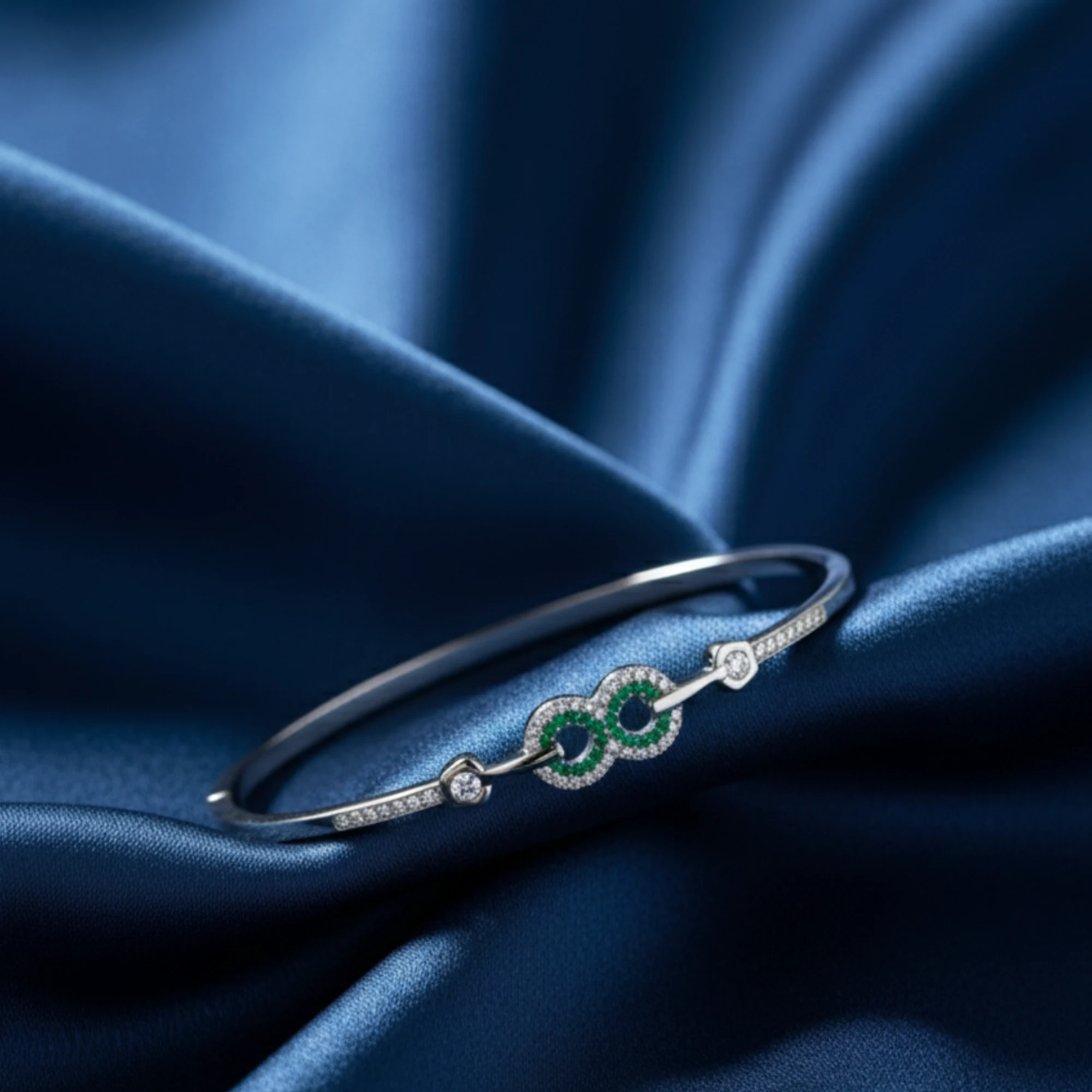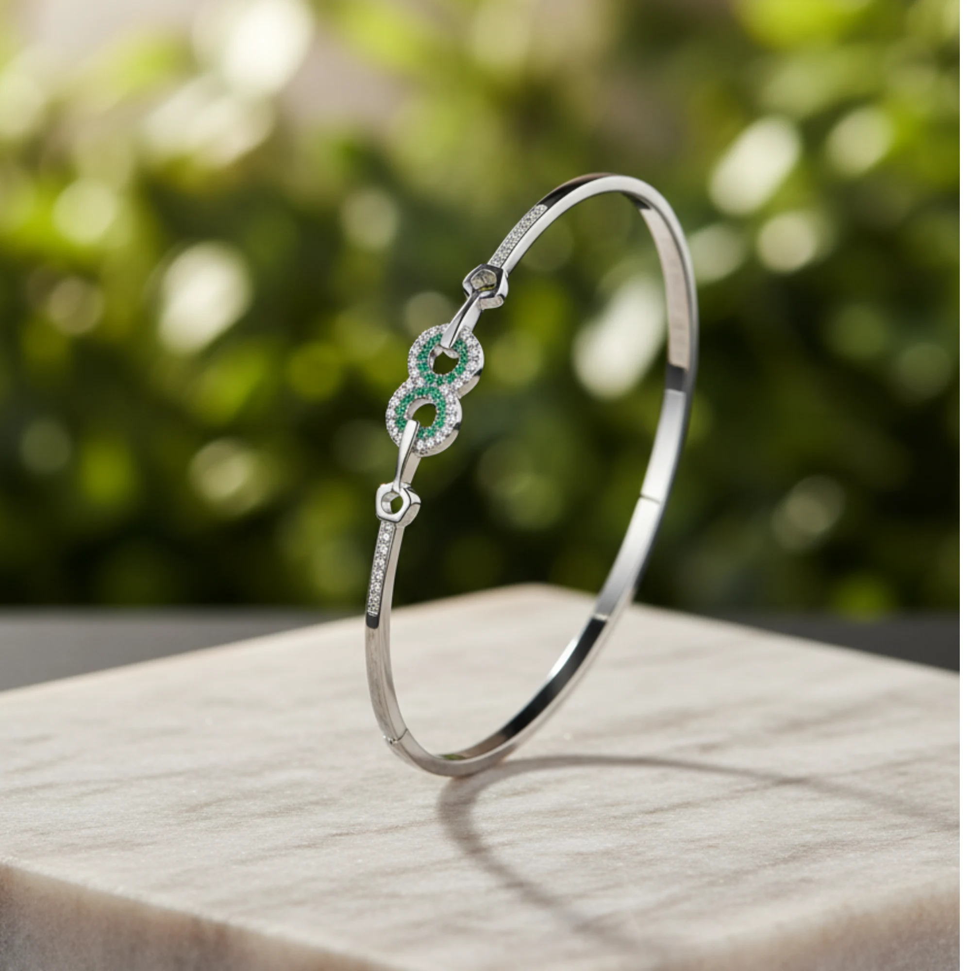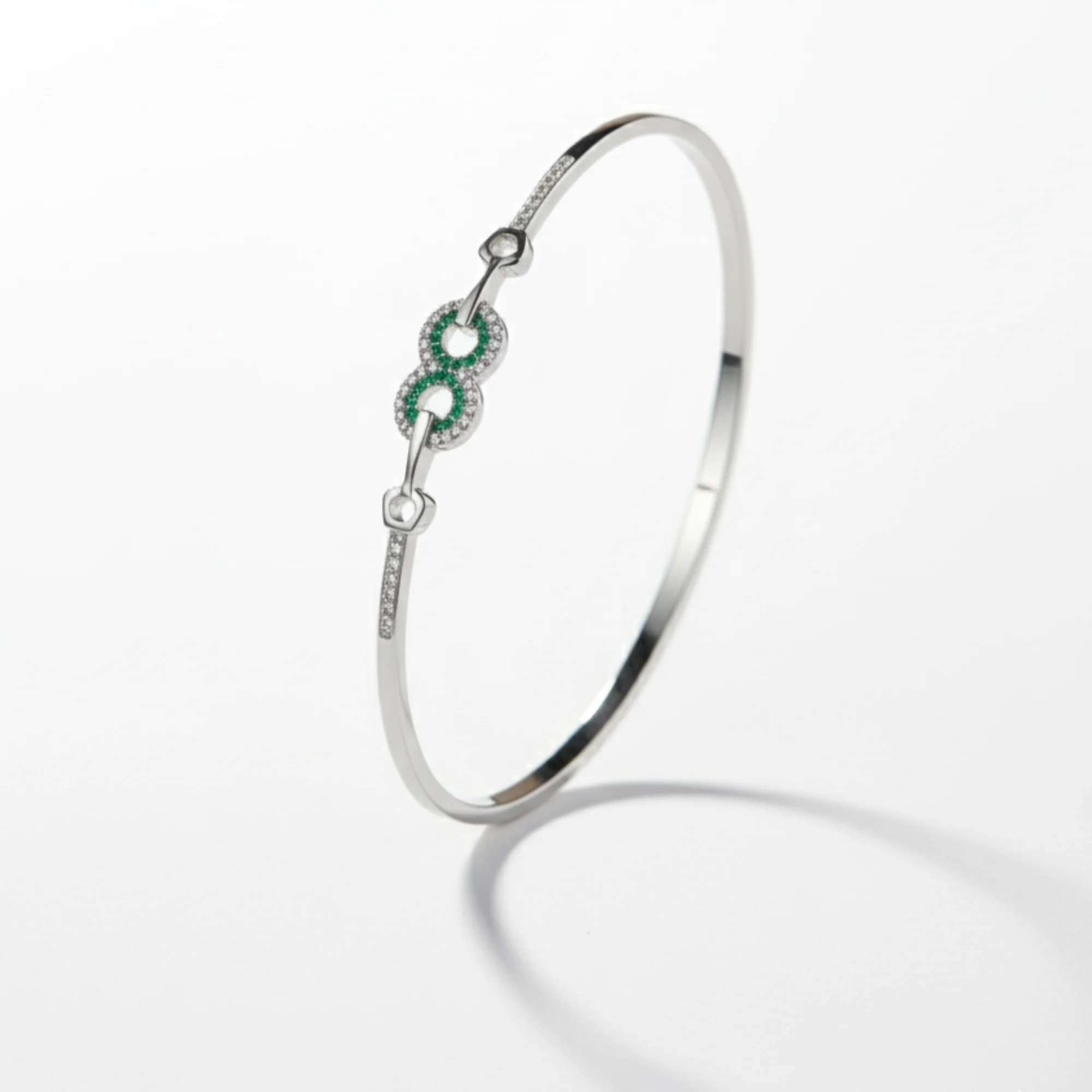 A graceful silver bracelet embellished with sparkling green stones, blending timeless charm with a refreshing touch of elegance.