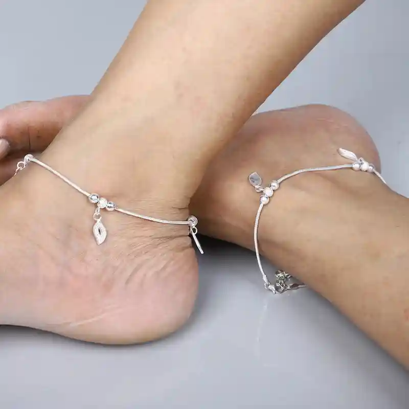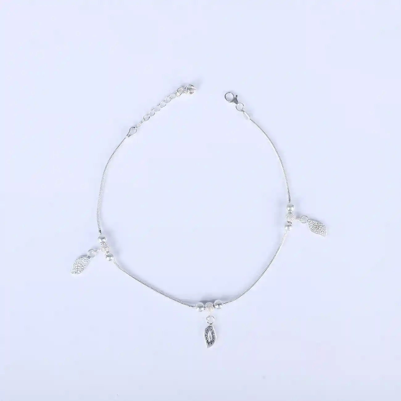 Delicate and enchanting, this 925 silver anklet features intricate leaf-shaped charms and polished beads — a perfect blend of elegance and nature-inspired grace.